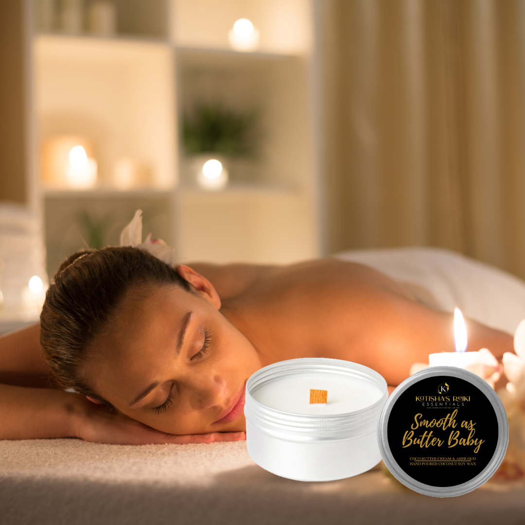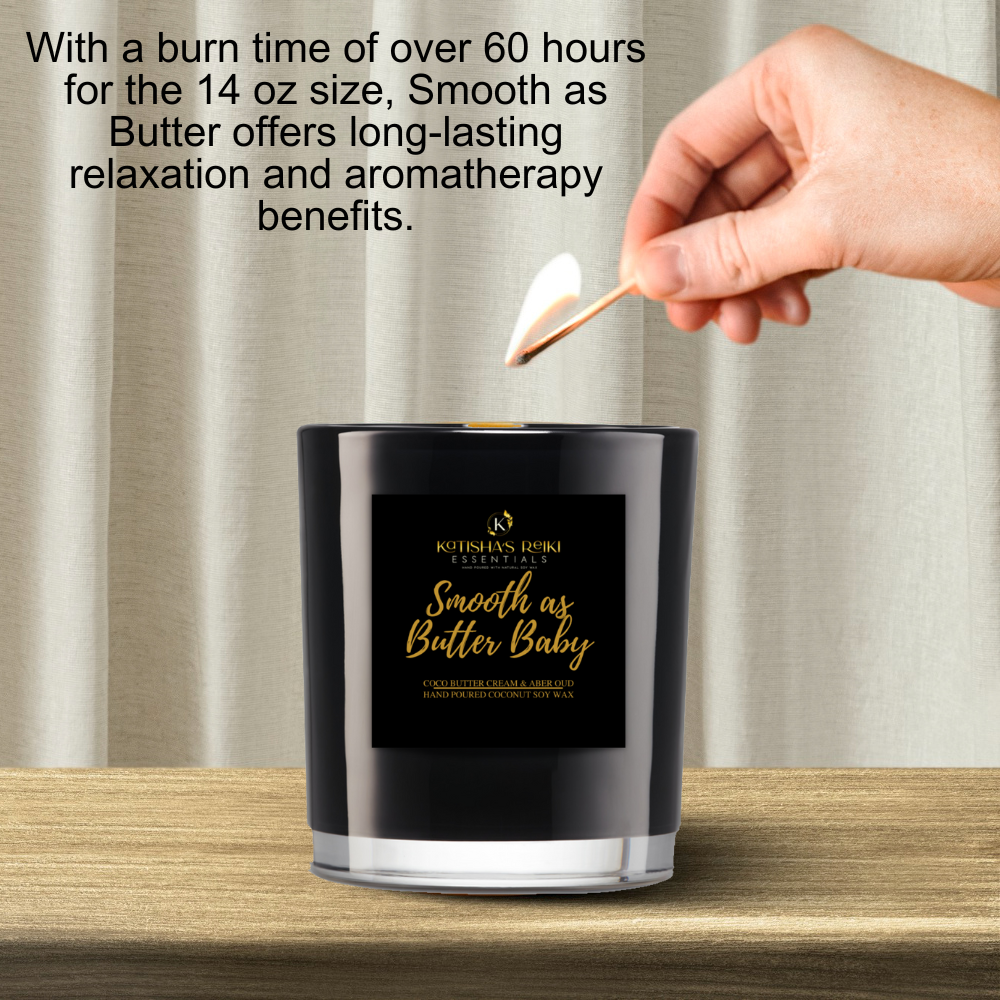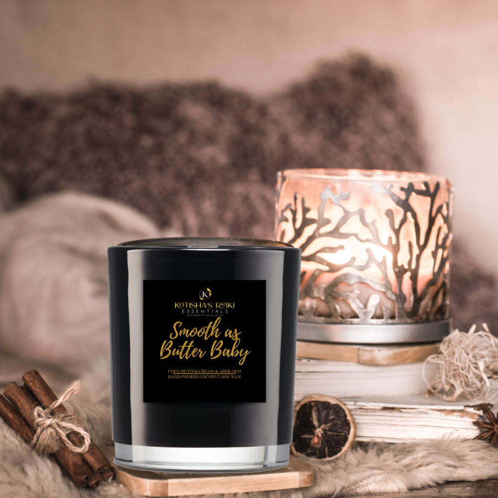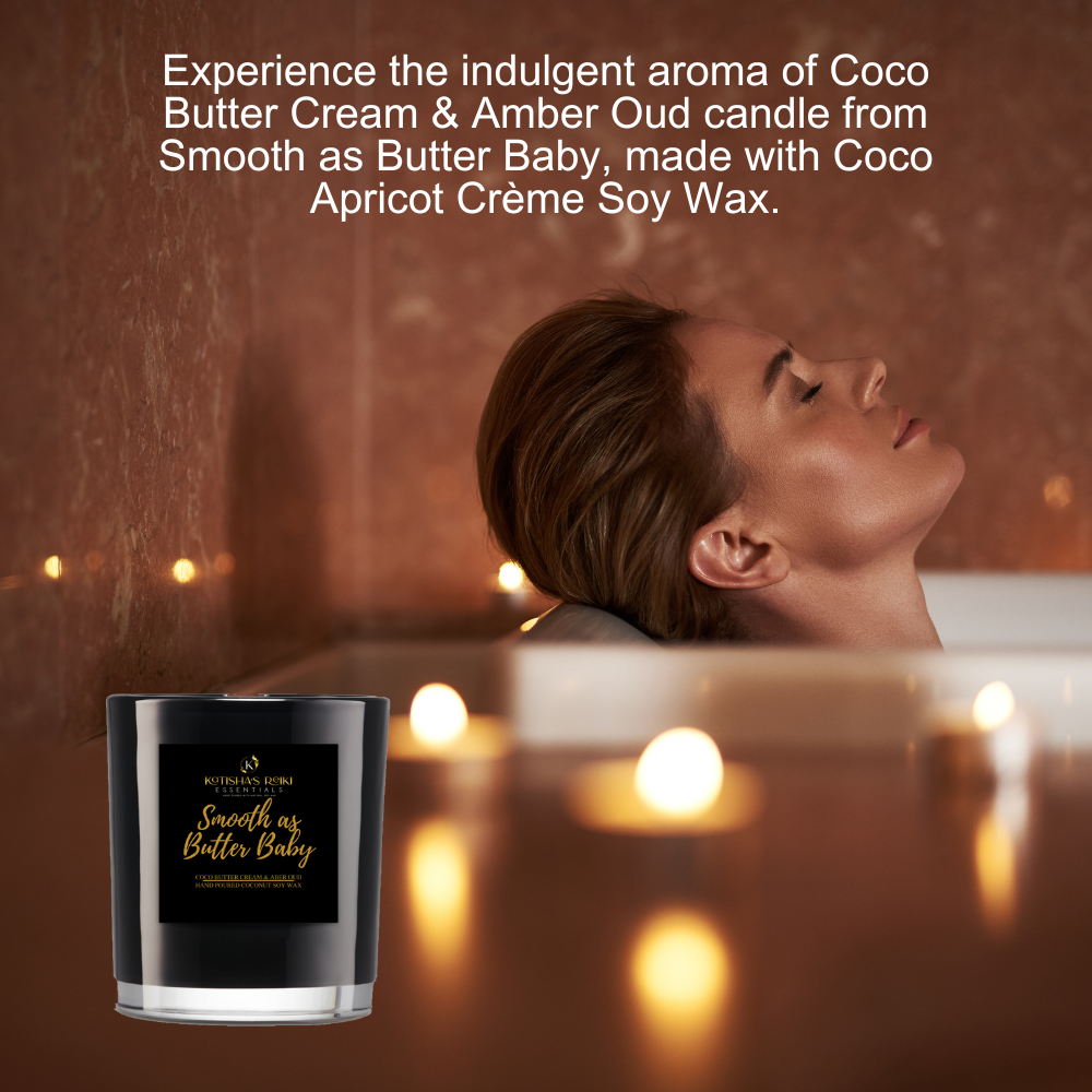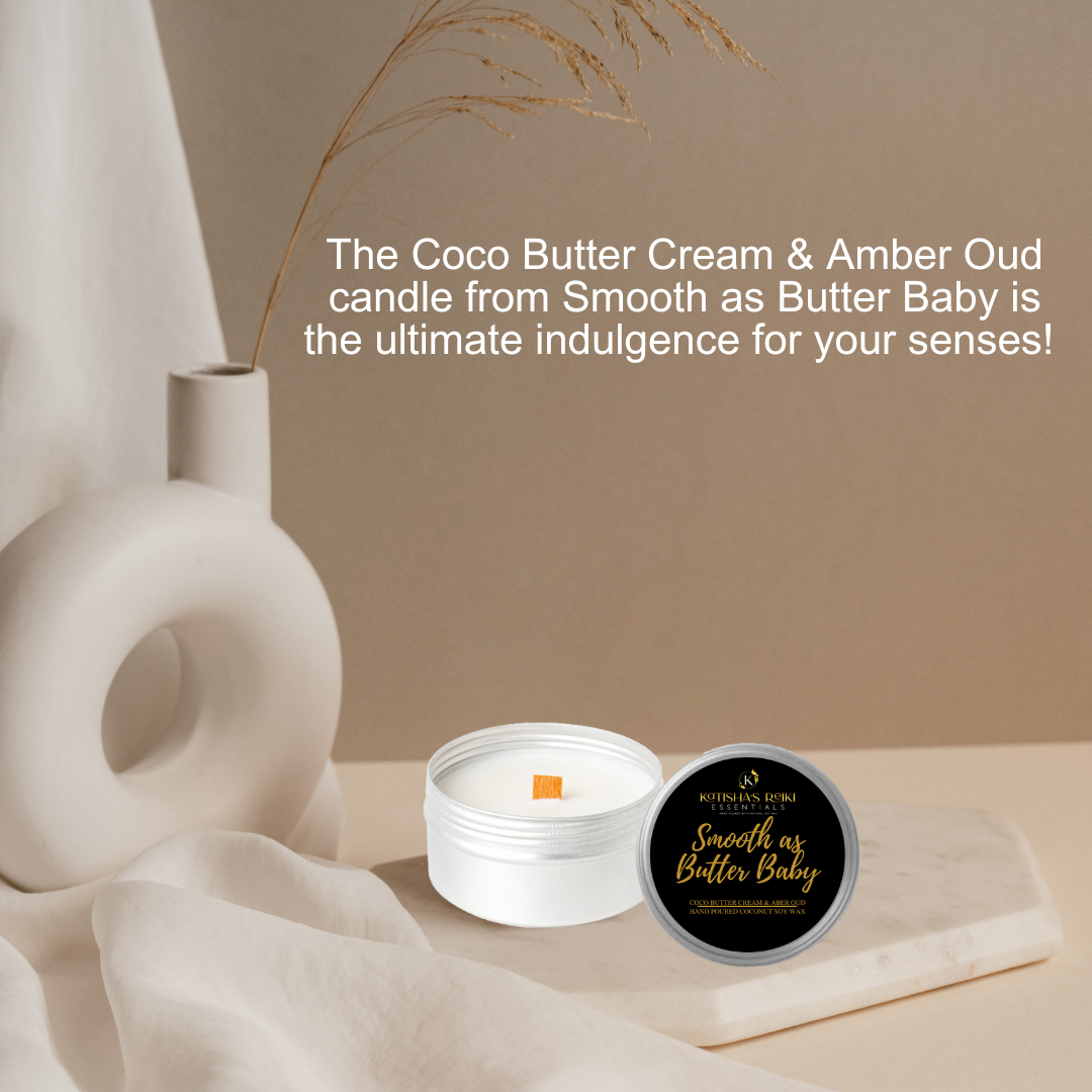 Indulge your senses with the Coco Butter Cream & Amber Oud candle from Smooth as Butter Baby, exclusively at Katisha's Reiki Essentials. Hand-poured with Coco Apricot Crème Soy Wax, this luxurious candle offers a truly captivating fragrance that transforms any space into a cozy sanctuary.